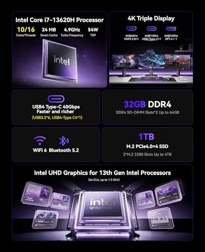 The KAMRUI Hyper H2 packs serious laptop-grade power in a tiny shell. The Core i7-13620H brings 10 cores and 16 threads for heavy multitasking. With 32GB RAM and a 1TB PCIe 4.0 SSD, apps load fast and stay snappy under load. USB4 and Wi‑Fi 6 make it future-ready for high-speed docks and networks.